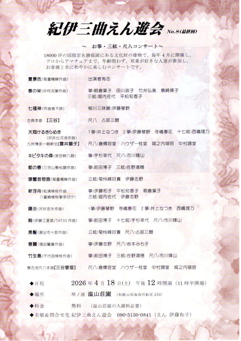 兵庫県宝塚市を拠点に 三味線音楽『地歌』 並びに『生田流箏曲』の演奏・教授活動をしております。 当サイトでは私の出演情報、お稽古案内などを掲載しております。