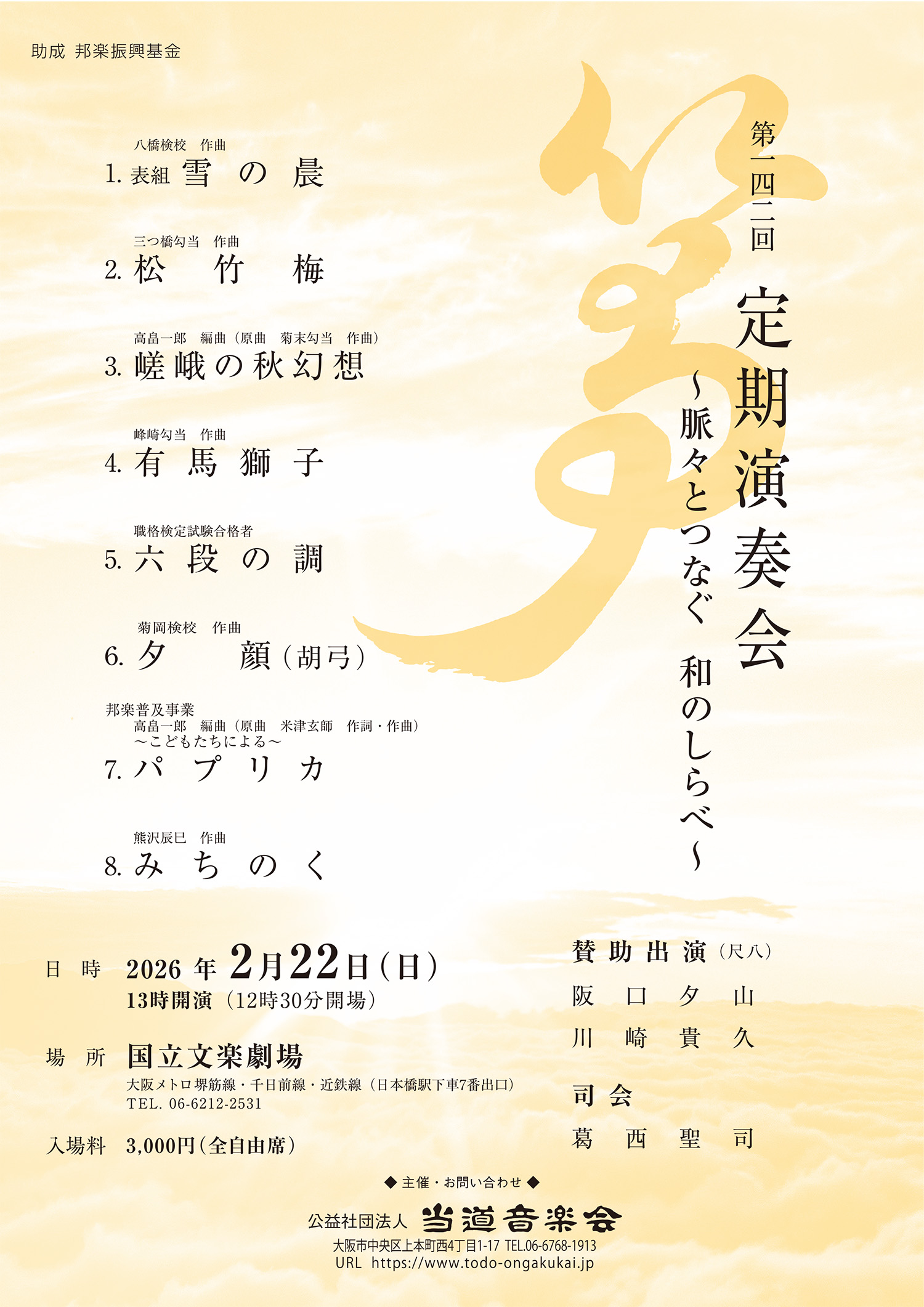 日時 令和8年2月22日(日) 会場 国立文楽劇場 松竹梅(三橋勾当作曲) 三絃替手(菊の朝) みちのく(熊沢辰巳作曲) 三絃